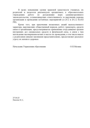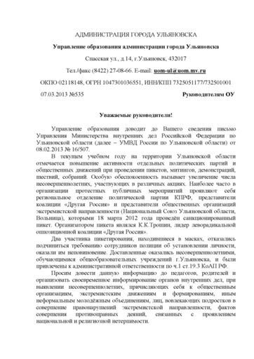 А что же Управление образования администрации города Ульяновска? Возмутилось? Гневно отвергло омерзительную просьбу? К сожалению, нет. В лучших традициях российского чиновничества приняли к исполнению и направили за подписью начальника управления образования О.Н. Мезиной в школы города. 7 марта 2013 года руководители образовательных учреждений получили этот документ.
