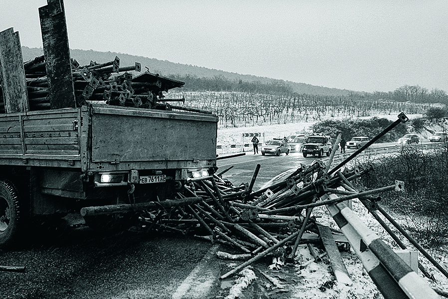 Полицейский кордон стоит почти сразу на выезде из Сукко. Где-то за ними — фура, рассыпавшая стройматериалы. Наблюдатели вспоминают, что в Сукко нет поста ДПС и транзитной дороги, а значит, полицейские машины сюда подогнали заранее. Нет и следов от торможения фуры. Волонтеры решают, что надо идти в город пешком. Когда они обойдут кордон, их встретят машины, присланные из города.