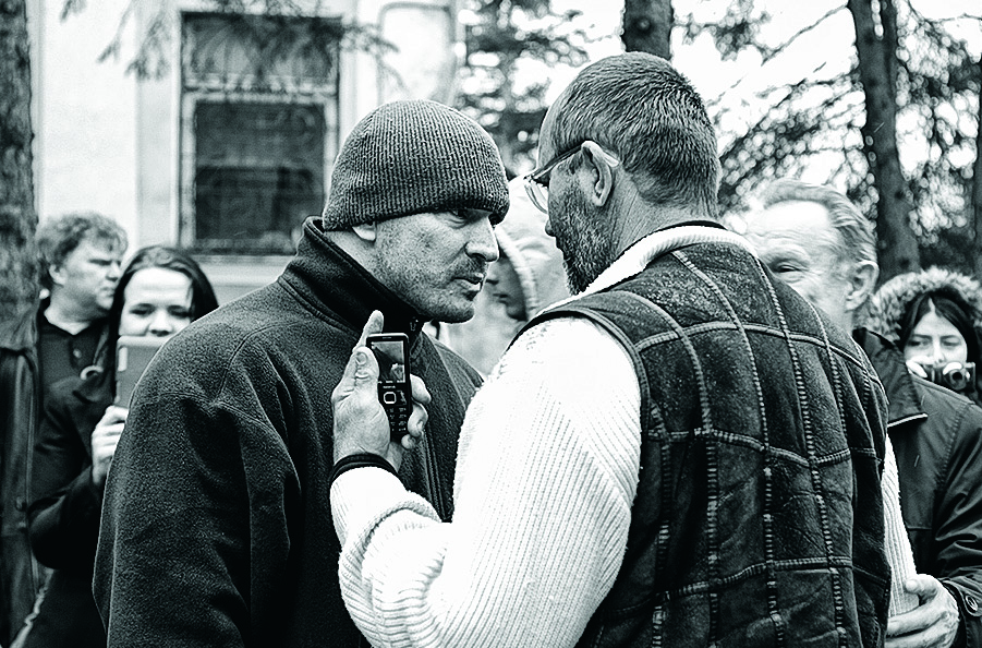 «По взглядам я монархист, поддерживаю диктатуру, а в наблюдатели пошел, потому что везде нужен закон и порядок», — разъясняет вахмистр казачьего войска Григорий Угкуров, 50-летний мужчина в камуфляже. «Нас поселили в одном номере, как мы друг друга еще не убьем?» — удивляется его оппонент, член «Солидарности» Виктор Чириков, высокий человек в очках.