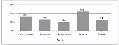 [4] Были опрошены методом анкетирования: 1019 потенциальных абитуриентов, 1009 их родителей и 2016 выпускников (2001—2006 гг. окончания) двадцати крупнейших вузов Большого Урала; методом формализованного интервью: 300 представителей крупного бизнеса и 100 представителей власти.