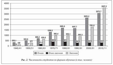 Еще одним значимым изменением (мало повлиявшим на распределение вузов по выделенным типам) стало распространение заочной и вечерней форм обучения. В течение двадцати лет, с 1950 до 1970 года, численность студентов-очников выросла в 2,6, а заочников — в 3,6 раза (вечерников — в 23). Можно интерпретировать эту меру как еще одну «привязку» системы высшего образования к запросам государственной экономики (рис. 2).