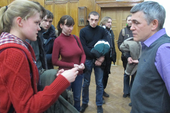 На лекции по астрономии приходят и математики. Так, Антон с 5 курс мехмата МГУ рассказывает, что ему очень нравится астрономия. «Интересно, как устроен мир. Сурдин умеет заинтересовать, здесь красивые картинки, так же можно подумать о математическом аппарате, здесь – простор для фантазии», – поясняет он свой выбор. И в этом его поддерживает Валентин, также с мехмата МГУ. «Я с детства читал много книг по астрономии, очень ей интересуюсь. А Сурдин рассказывает просто, доступно, интересно и познавательно».