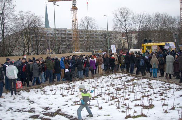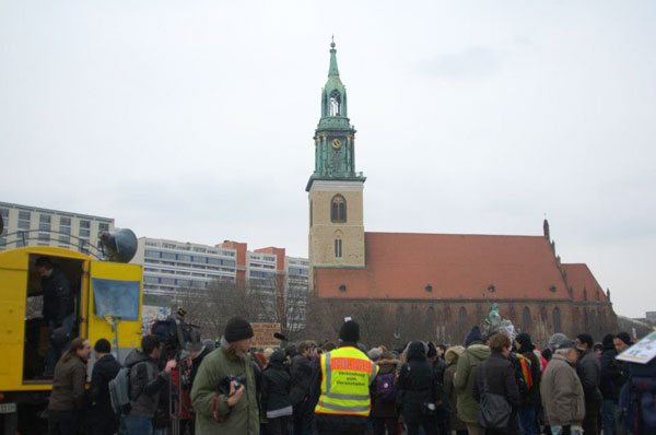 На демонстрациях в основном выступают именно левые и демократы. Практически каждый выступающий отмечал, что народ собрался в этот необыкновенно холодный для Берлина день на демонстрацию, потому что не собирается больше это терпеть.