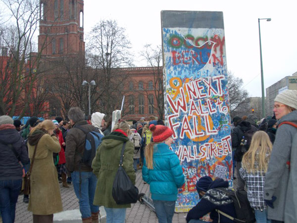 Акция в защиту Берлинской стены К 10 утра число протестующих достигло 400 человек. Их действия привели к тому, что в 11:15 полиция сообщила по громкоговорителю о прекращении работ, строительные краны отъехали, протестующие разошлись, и в 12:30 ничего, кроме зияющей дыры на месте одного из блоков стены, не выдавало бушующих только что эмоций. Мюленштрассе (Mühlenstraße), на которой находится галерея, вновь была открыта для проезда транспорта. Только за 1 марта петицию с протестом в адрес Клауса Воверайта подписали 50 тыс человек.