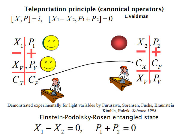 «Кто-то говорил, по-моему, Фейнман, что если вам кажется, что вы понимаете квантовую механику, значит, вы ничего не понимаете», – весело заметил лектор. Но тут же довольно доходчиво объяснил слушателям, как же квантовая телепортация все-таки может осуществиться. Для этого нужно будет знать: 1) расстояние между двумя перепутанными состояниями двух объектов х1 – х2 и 2) сумму их скоростей (импульсов) р1 + р2. Найти расстояние и сумму скоростей квантовая механика делать не запрещает.