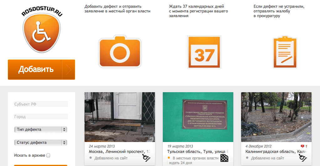 С тем, что называется «недоступной средой» можно бороться по-разному: писать громкие обращения в СМИ или с помощью малых дел: каждый может оформить заявку через сайт «Росдоступ», указав объект инфраструктуры, не приспособленный к проходу людей на инвалидных колясках, – проблема должна быть решена в течение 37 дней.