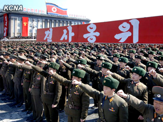 Участники акций заявляют о готовности с оружием в руках "нанести мощный удар по врагам народной республики" и, если потребуется, "отдать свои жизни в священной борьбе за руководителя, партию, страну и народ".