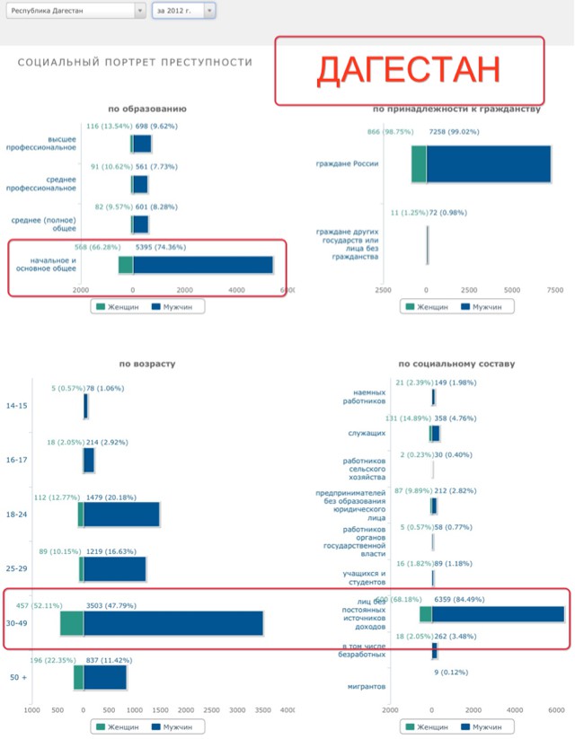 А если сложить все эти крупные показатели, то получается, что средний дагестанский преступник — это гражданин России, в возрасте 30-49 лет, имеющий только начальное среднее образование и не имеющий постоянного источника дохода, ранее осужденный.