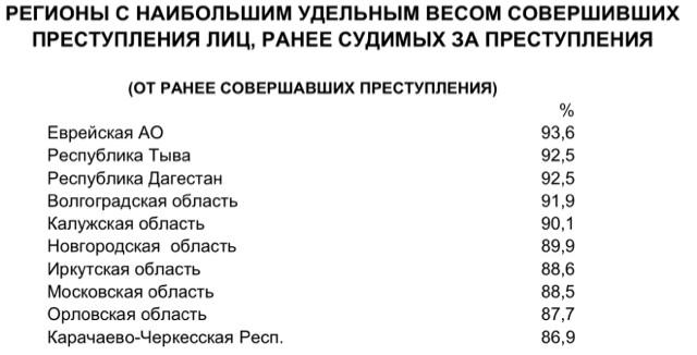 Но дагестанские осужденные уже много лет в десятке лидеров среди лиц, совершавших преступление ранее — 92,5% из СКФО в десятку лидеров с нами попала и КЧР— 86,9%, хотя раньше соседство с ними в этой группе лидеров поддерживала и Ингушетия. Практически сажаем одних и тех же. Это показатель отсутствия нормальной работы МВД и ФСИН по адаптации осужденных. Или кто-то здесь врет.