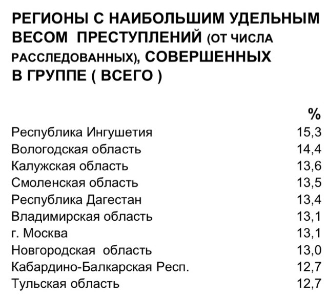 Если взять статистические данные МВД РФ, то получается, что дагестанская преступность в десятке лидеров по организованности с удельным весом 13,4% от всех совершенных на территории республики преступлений, но мы в "кооперации" проигрываем Ингушетии — 15,3%, зато выигрываем у КБР — 12,7%.