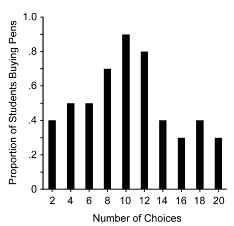 Что характерно, подвоха не было. Покупающий действительно мог сэкономить, так как ручка действительно стоила дороже той цены, по которой ему предлагали. То есть схема немного отличалась от той, которая используется торговцами в электричках. Сделка, со всех сторон, выгодная. Казалось бы, человеку разумному, чем больше выбор — тем больше вероятность удовлетворить любой вкус, тем активнее должны покупать, постепенно упираясь в насыщение.