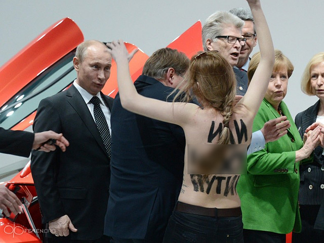 В тот момент, когда Путин и Меркель стояли у стенда компании Volkswagen, несколько девушек, которые находились среди многочисленных журналистов, прорвались за ограждение, разделись по пояс и стали выкрикивать нецензурные лозунги на английском языке. Неприличные фразы были написаны и на их телах, передает "Интерфакс". Путина, в частности, называли "диктатором", сообщает Reuters.