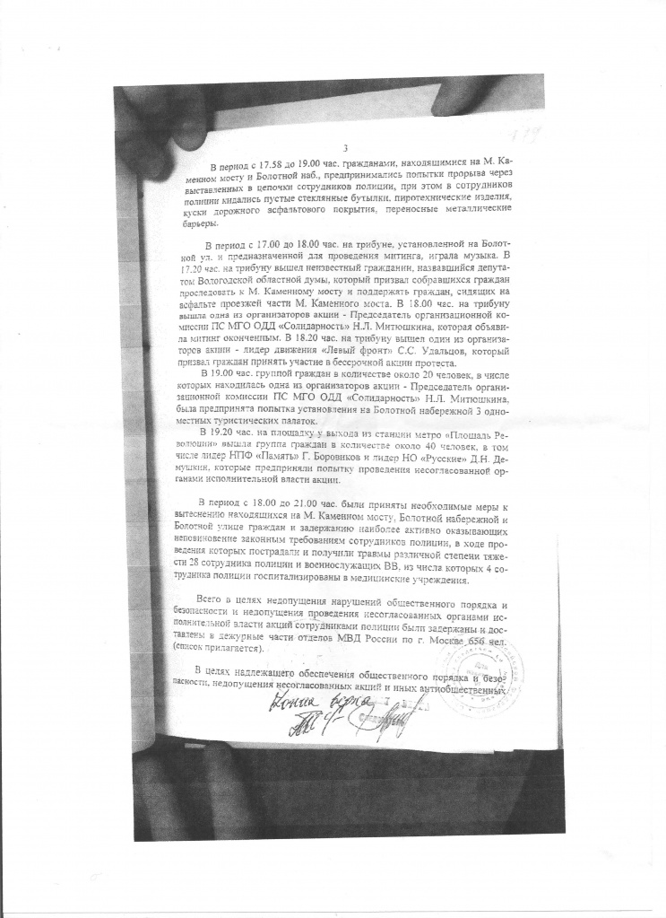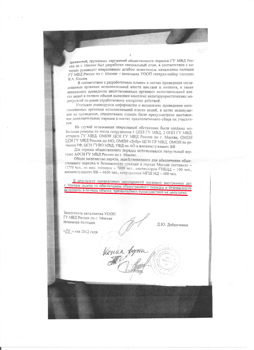 В "Справке по результатам обеспечения общественного порядка и безопасности в г. Москве 6 мая 2012 г." заместитель начальника УООП ГУ МВД России по г. Москве полковник полиции Д.Ю. Дейниченко пишет: "В результате проведенных мероприятий органами внутренних дел г.Москвы задачи по обеспечению общественного порядка и безопасности выполнены в полном объеме, чрезвычайных происшествий не допущено".