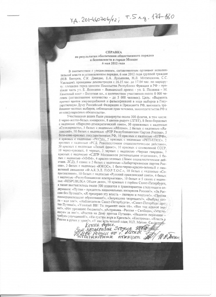 В "Справке по результатам обеспечения общественного порядка и безопасности в г. Москве 6 мая 2012 г." заместитель начальника УООП ГУ МВД России по г. Москве полковник полиции Д.Ю. Дейниченко пишет: "В результате проведенных мероприятий органами внутренних дел г.Москвы задачи по обеспечению общественного порядка и безопасности выполнены в полном объеме, чрезвычайных происшествий не допущено".