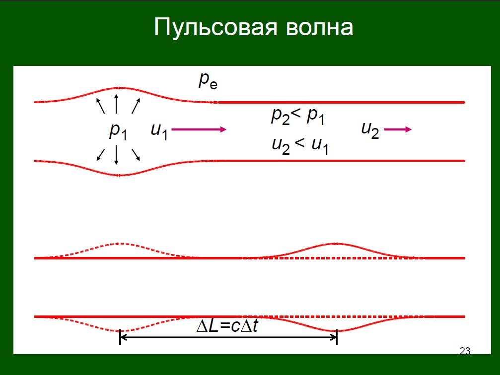 Это объяснение из его диссертации. Эрлангер, один из первых исследователей, говорил, что это гидравлический удар. Еще более умные люди говорили, что это опрокидывание пульсовой волны, мы тогда не знали про их работы и открыли это сами. Но я все же расскажу сначала, что такое пульсовая волна, а потом про того, кто это действительно открыл, и как. Итак, сердце выбрасывает кровь в артерии, там повышается давление, это повышенное давление растягивает сосуд, здесь давление больше, чем впереди по потоку, и кровь с большей скоростью начинает двигаться в сторону более низкого давления.