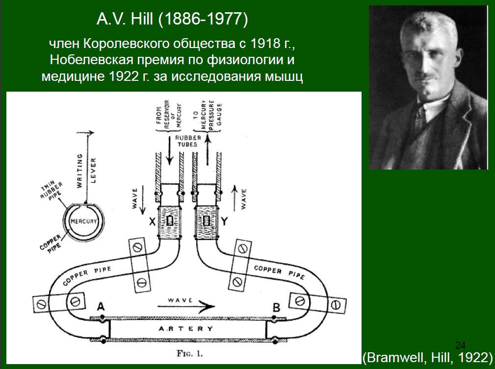 Соответственно, этот горб начинает перемещаться с некоторой скоростью, эту скорость можно померить, это скорость пульсовой волны. Сейчас больным в клинике меряют скорость пульсовой волны. Это метод диагностики, способ узнать про элестичность артерии. Так вот, первый важный шаг был сделан этим удивительным человеком, которого звали Арчибальд Вивиан Хилл. Когда я рассказываю про него студентам, я называю это «Дорога из «качков» в «ботаны»».