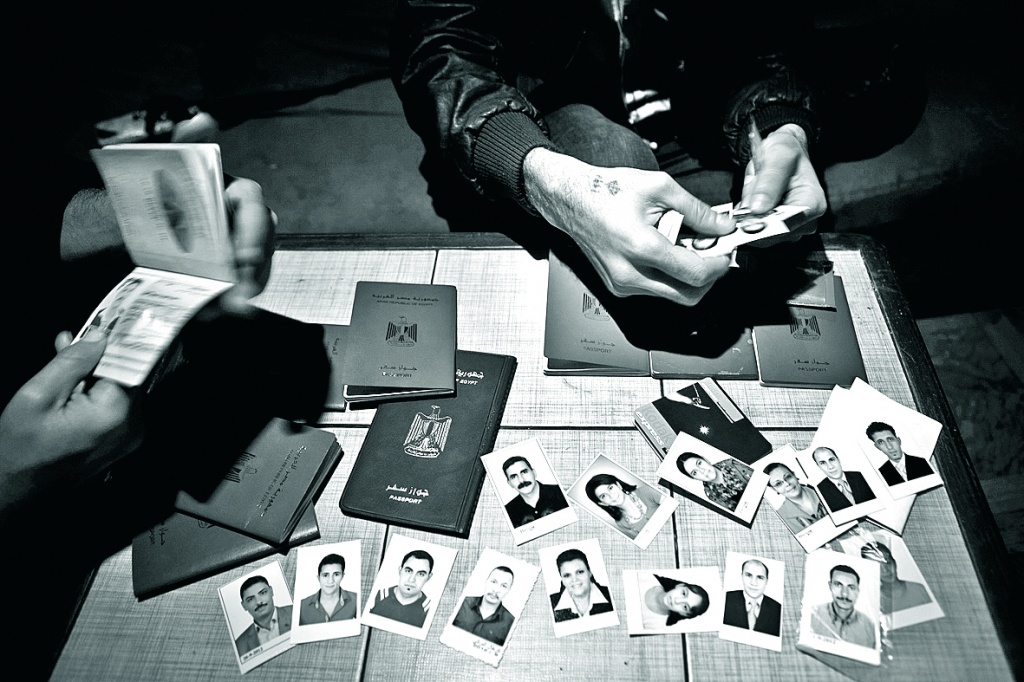 Полночь в кафе Оз: здесь нельзя взять интервью, можно лишь поговорить в полумраке. Город Гиза — один из немногочисленных пустынных оазисов в окрестностях Нила. Такое может случиться только здесь и сейчас, в невероятно тихую пятницу вдали от столичных огней и революционных и реакционных настроений, в Египте, чья молитва направлена в сторону Мекки. У 29-летнего гида С. на теле есть несколько татуировок крестов и образ Богородицы, хотя это скорее его отличительная черта, чем символ религиозных убеждений. Он вытряхивает из сумки кучу паспортов и фотографий. Пять лет назад С. стал контрабандистом христианских душ, в последнее время количество заказов резко возросло, и он зарабатывает до $1 тыс. в день.