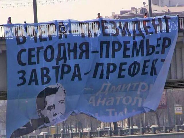 Оппозиционеры "понизили" Медведева, вывесив плакат напротив Белого дома: "Сегодня премьер! Завтра - префект!"