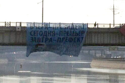 В Москве на Новоарбатском мосту — напротив Белого дома — оппозиционеры вывесили баннер: "Вчера — президент! Сегодня — премьер! Завтра — префект!". Об этом сообщает "Грани.ру" в Twitter.