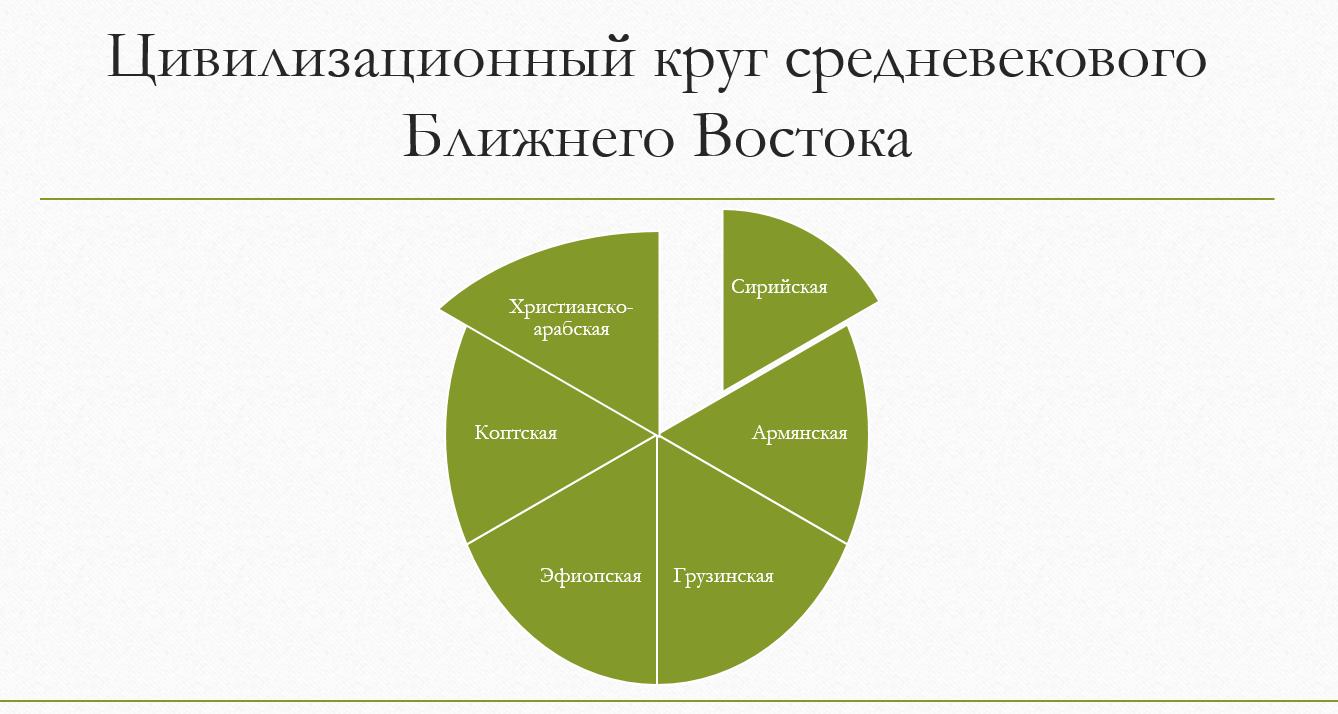 Общая черта, помимо христианства, у них очень интересная – это письменность. Письменность практически всех этих групп возникает примерно в одно и то же время. Эта письменность часто именуется миссионерской. Ну вот, смотрите - армянская и грузинская письменность возникает примерно в 4 веке, и в той или иной степени это связано с деятельностью просветительского движения Закавказья. Эфиопская письменность возникает примерно в то же время. Коптская письменность - чуть раньше в Египте, как вариант адаптации греческой письменности к позднеегипетскому языку. И сирийская - в это же время. Христианско-арабская цивилизация возникла из этих разных цивилизаций. После завоевания, прежде всего, арабского в 7 веке, когда большая часть христиан Ближнего Востока перешла в ислам, а другая просто арабизировалась. В результате умалилась сирийская часть, коптская часть, возникла христианско-арабская. В целом, этот круг Ближнего Востока остается достаточно стабильным и по настоящее время.