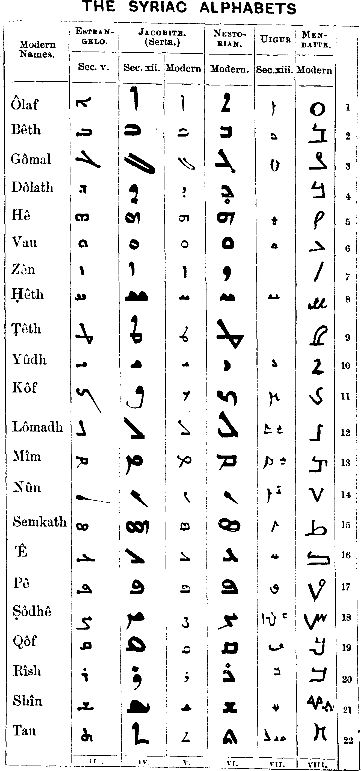 Оно представляет различные формы курсивизации этого квадратного письма, известного вам по еврейскому, которое было эпиграфическим, но требовало упрощения, чтобы писать быстро и слитно. В отличие от эфиопской, все письменности семитской группы повторяют один и тот же порядок, это порядок нашего алфавита А, Б, В, Г, Д, - это порядок, который характерен для всех семитских письменностей. Грубо говоря, мы пользуемся семитской системой письма; алфавит греческий, от которого произошел и русский, - в основе семитский. Сирийцы пользуются тем же алфавитом в трех его разновидностях. Первая разновидность – это более строгая эстрангела (от греч. στρογγύλη, округлое), затем – курсивное письмо сертó, им пользуются в основном западные сирийцы, сохранившие приверженность православию. Восточные сирийцы сохранили верность церкви Востока, и их письмо называется у нас «несторианским».