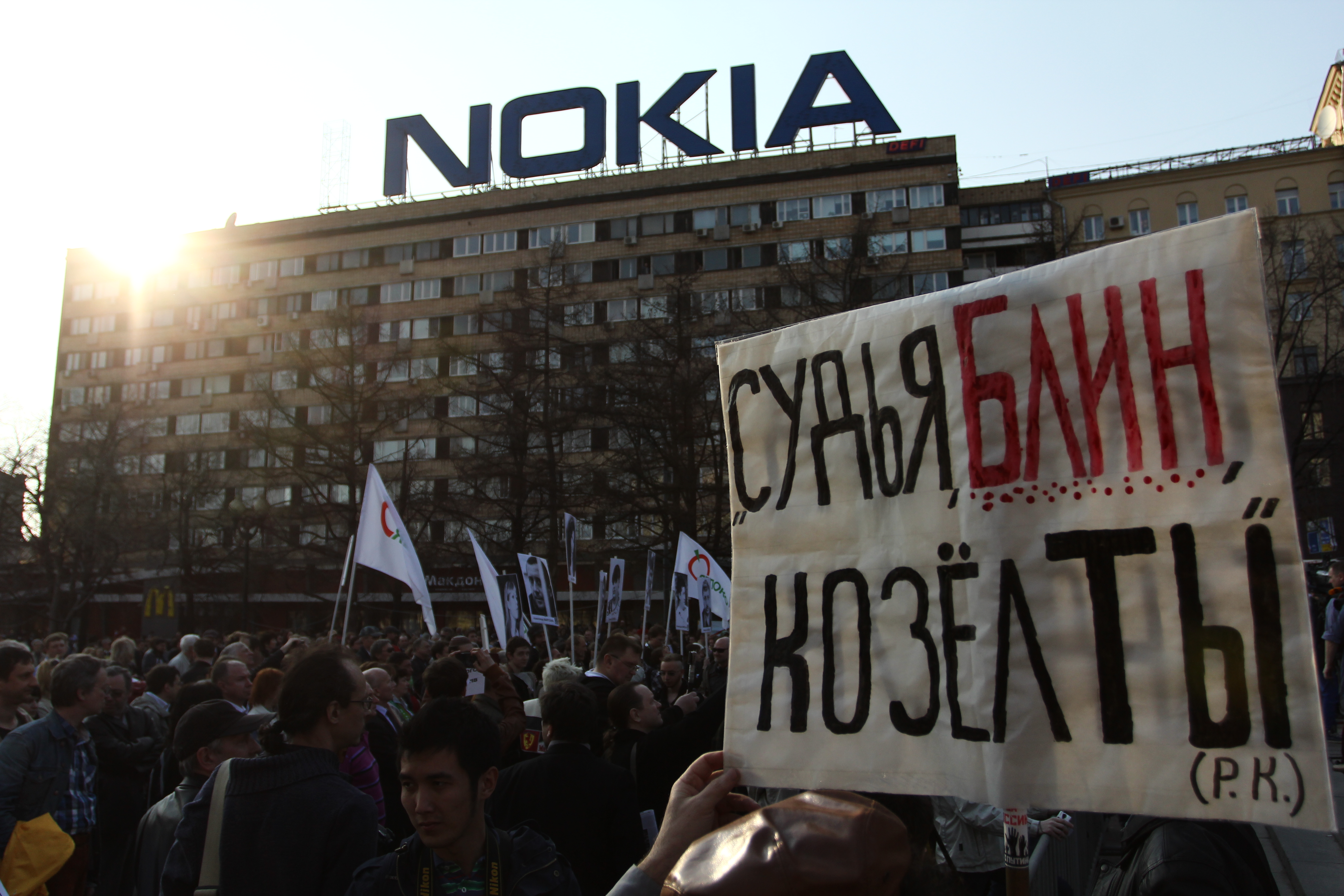 Среди лозунгов на митинге были и не самые лестные по отношению к российской судебной системе На акции в Новопушкинском сквере было примерно четыре-пять тысяч человек. Как обычно на подобного рода акциях, участники принесли плакаты с изображениями политических заключенных, прежде всего "узников Болотной". Вновь были стенды, на которых раздавали открытки – их можно отправить политзаключенным. Вновь собирали деньги в поддержку узников.