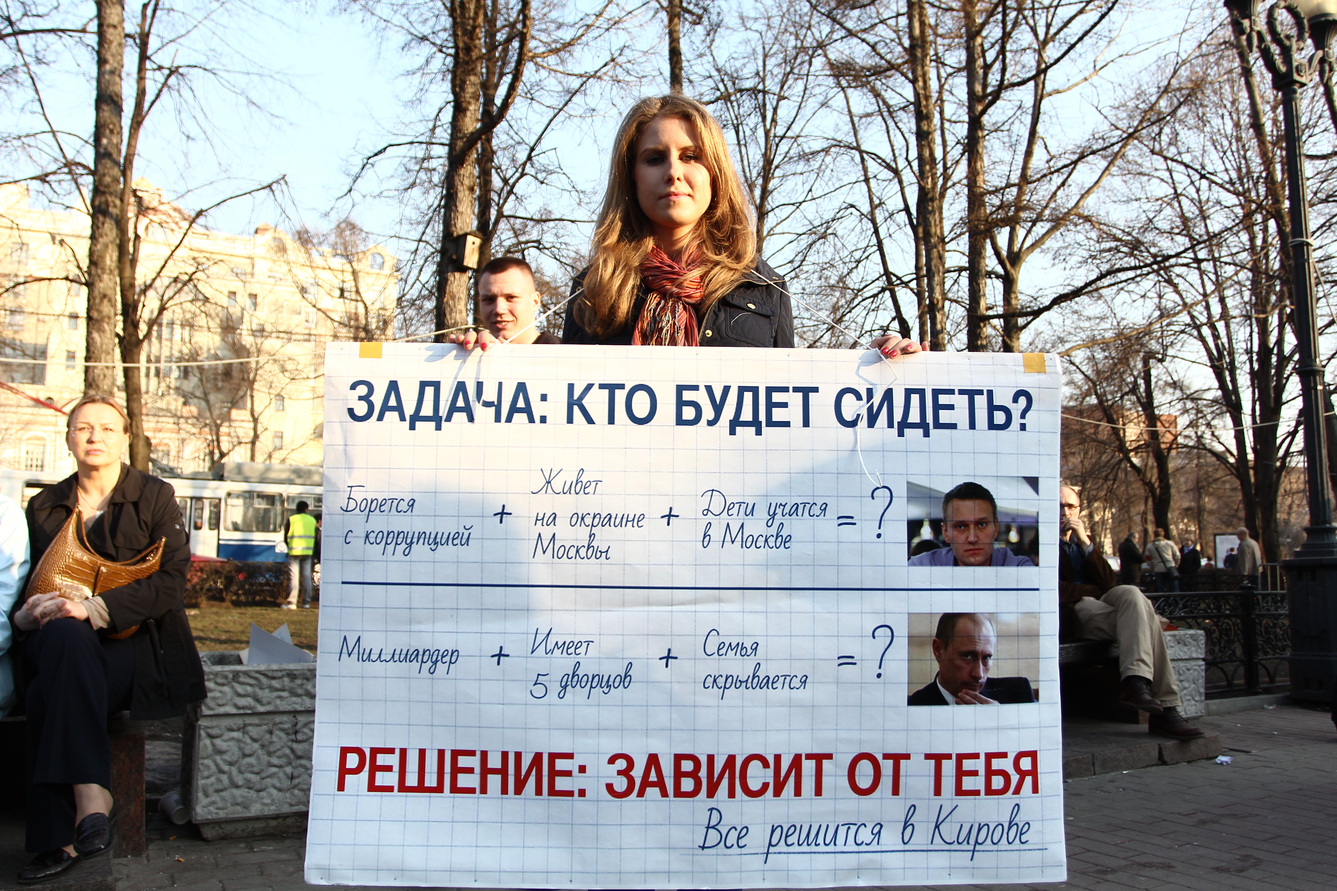 Одна из участниц акции пришла на нее с таким плакатом Митинг очень быстро перестал быть акцией в поддержку Алексея Навального и перерос в традиционный митинг солидарности с политзаключенными. Отчасти это, наверное, объясняется решением суда в Кирове перенести заседание по делу Навального на неделю.