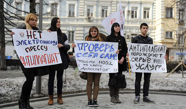 Пикет у мэрии Москвы. Фото: Антон Белицкий/Ridus.ru На днях у здания Минобрнауки в Москве прошла акция неизвестных топлес-активисток, подражающих участницам движения Femen. Основными лозунгами, которые девушки написали на собственной груди, стали отставка Дмитрия Ливанова и запрет «Антиплагиата». Кем было организовано необычное мероприятие — неизвестно. Применение программы резко осудил в последнем интервью и рупор этой информационной компании — Владимир Бурматов. Он назвал «Антиплагиат» средством борьбы с «неугодными критиками министерства образования».