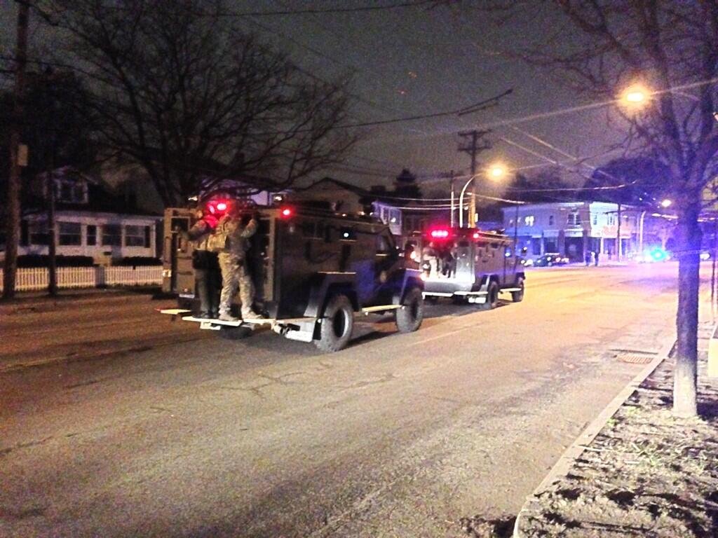 Сейчас сотрудники производят поквартирный поиск. Спецназ, агенты ФБР и подразделения национальной безопасности начали патрулирование города. Власти призывают граждан оставаться внутри своих домов, так как район считается чрезвычайно опасным. Над домами навис вертолет. Сообщается, что одно из зданий, освещается полицейскими прожекторами.