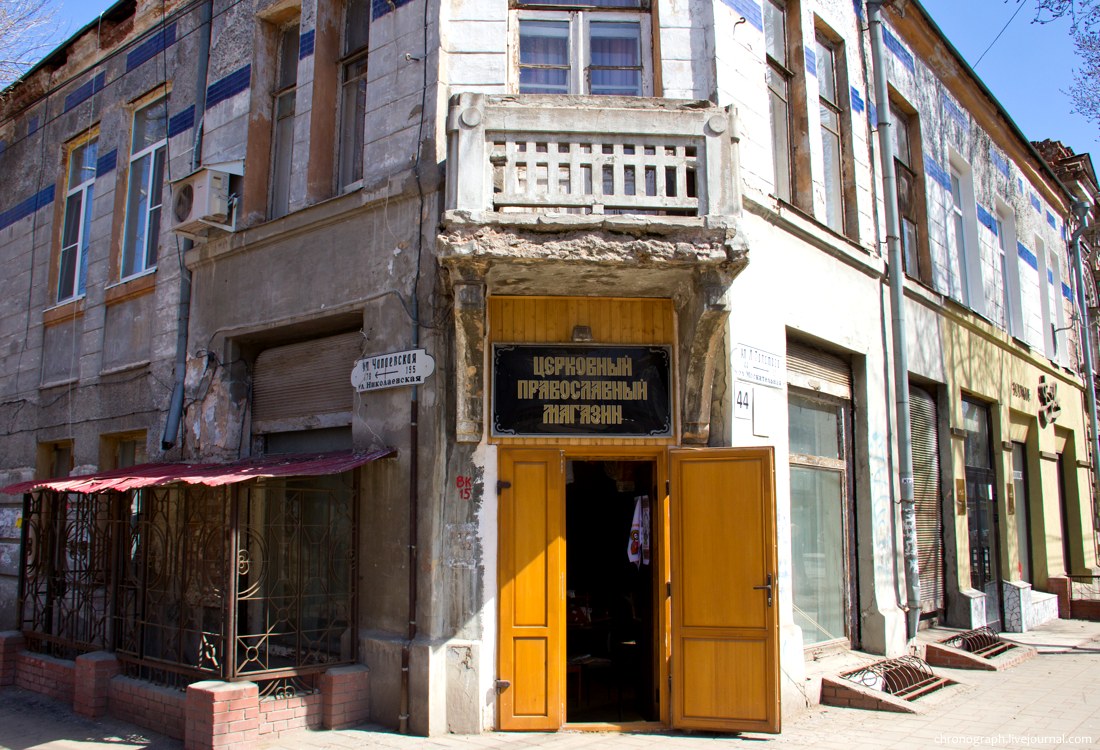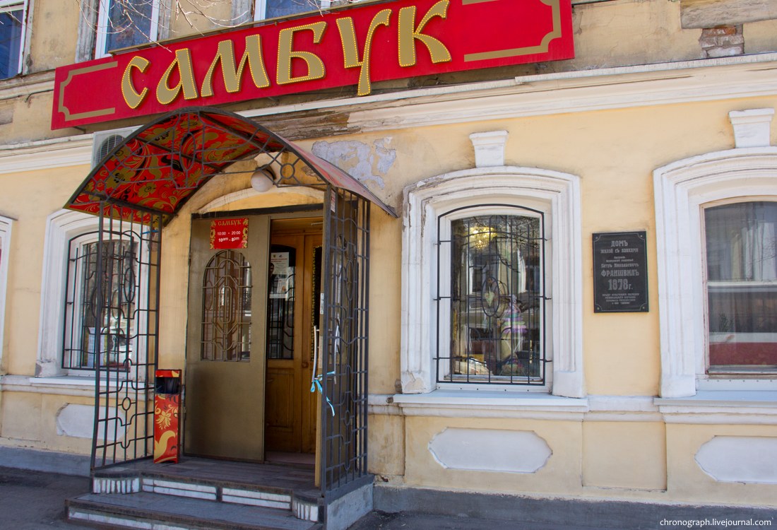 56. Далее возвращаемся по ул. Фрунзе. Сувенирный магазин "Самбук". Памятная табличка гласит: "Дом жилой с лавками построил французкий подданный П. Н. Франшвил в 1878 году".