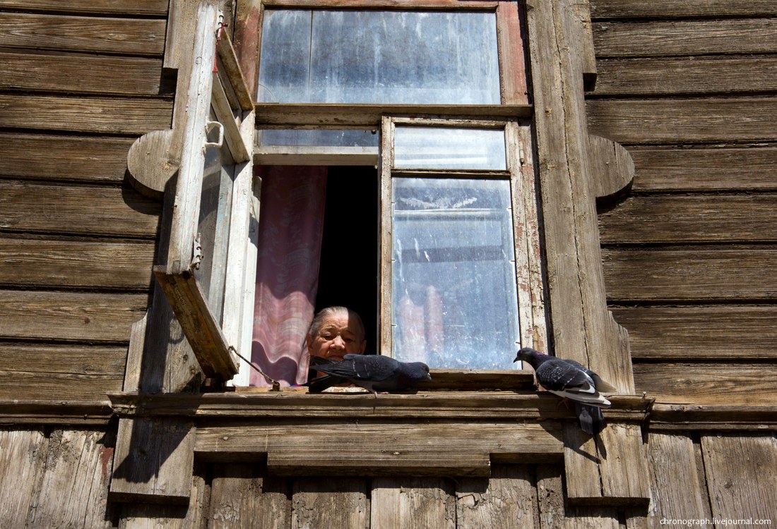 54. Бабушка кормит голубей из окна.