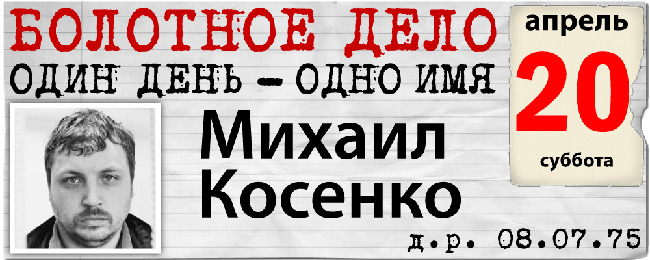 20 апреля - день солидарности с Михаилом Косенко. Ему 38 лет. Арестован 8 июня 2012 года. Возможно, Михаил находится в самом трудном положении среди всех обвиняемых по Болотному делу. Ему вменяется самая тяжелая - 2-я часть 318-й статьи УК (причинение вреда, опасного для жизни или здоровья). Следствие считает, что он вместе с признавшим свою вину Максимом Лузяниным избивал бойца ОМОНа. В то время как единственное имеющееся видео показывает, что он стоял позади драки, не принимая в ней участия. Но не только в этом дело.