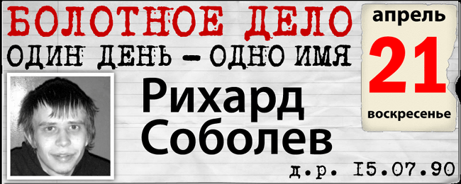 21 апреля – день солидарности с Рихардом Соболевым, одним из 27 фигурантов "Болотного дела". Рихарду 22 года. Он состоит в движении "Русские".