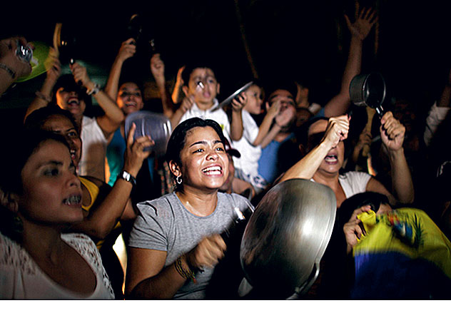 Сторонники преемника Чавеса — Николаса Мадуро, победившего на выборах 14 апреля с перевесом менее 2% голосов* в ответ запускают ракеты, выкрашенные в цвета национального флага, но их фейерверки не так слышны. Лидер оппозиции Энрике Каприлес призвал своих сторонников не выходить на улицы, чтобы избежать новых жертв в столкновениях с правительственными войсками — в первые дни после выборов в стычках погибли семь человек и 61 получили ранения. Но cacerola («кастрюльный бунт») будет продолжаться сколь угодно долго.