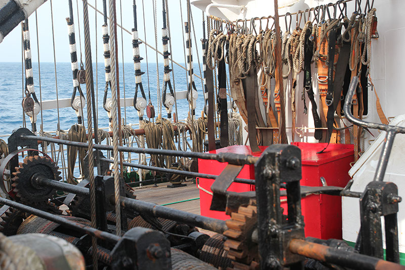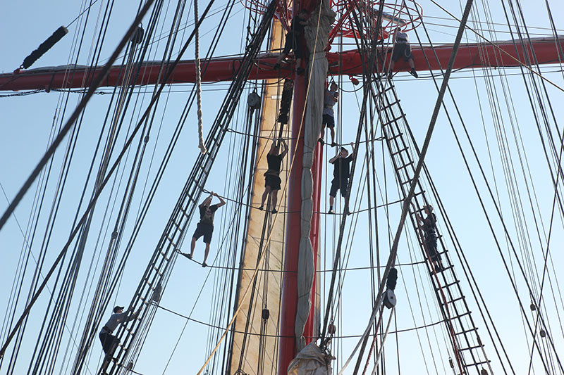 С утра я не люблю торопиться, поэтому встаю ровно по подъему или немножко раньше. Утром, до развода курсантов, собираю на мостики боцманов. Приходит капитан, старпом, они ставят задачу на день, объясняют, что нас ждет, я ставлю задачу по работе для боцманов, кому на какой мачте что делать нужно, то же самое — плотникам и парусному мастеру. Решаем рабочие вопросы — где парус снять в ремонт, какую снасть поменять. И после этого, как решили все рабочие вопросы, строим курсантов на малую приборку. После приборки начинается рабочий процесс — или по работе с парусами, с такелажем, или же с покраской судна, с наведением порядка. Если не отвлекают парусные авралы. А парусные авралы — это тоже рабочий процесс, вот такой выбивающий из ритма, но необходимый. Какие-то с обслуживающим персоналом вопросы решаются. Как такового конца рабочего дня нет, весь световой день — это рабочий день.