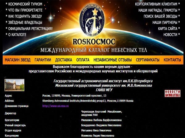 На сайте этой фирмы можно увидеть фотографии звезд культуры и шоубизнеса от Константина Райкина до Филиппа Киркорова, держащих в руках сертификаты с подаренными небесными объектами. Однако астрономов поразило то, что на сайте продавцов «воздуха» содержится благодарность множеству российских и международных научных институтов и обсерваторий. В список «партнеров» попали такие уважаемые научные организации как ГАИШ, Институт астрономии РАН, Институт космических исследований РАН, Институт прикладной Математики им М.В. Келдыша РАН, Астрономический институт им. В.В.Соболева Санкт-Петербургского университета и многие другие.