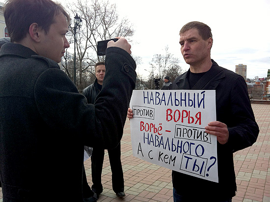 На "антинавальном пикете" на другой стороне улицы Спасская стоят человек пять с плакатами. Говорят, что Навальный им неприятен и что он украл лес.