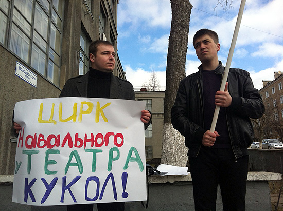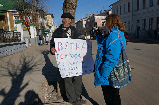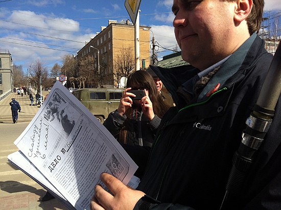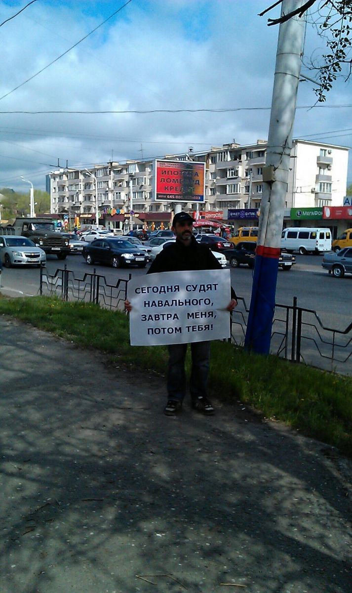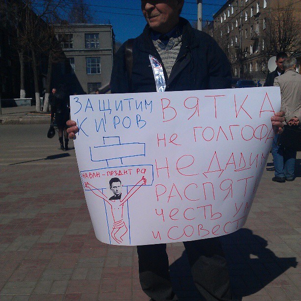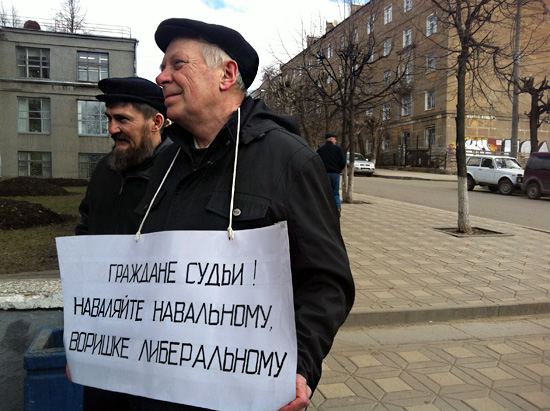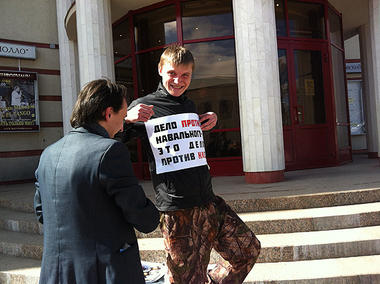Это Сергей из Кирова. С удивлением узнал, что в суд пускают любого гражданина и он тоже может пройти, но вспомнил, что забыл дома паспорт. Надевая на себя плакат "Дело против Навального — дело против меня", заявил: "России — русскую власть!"