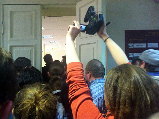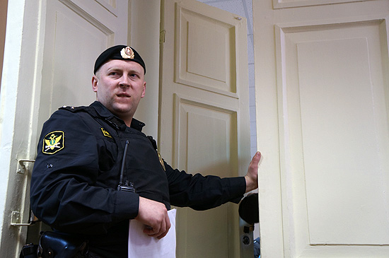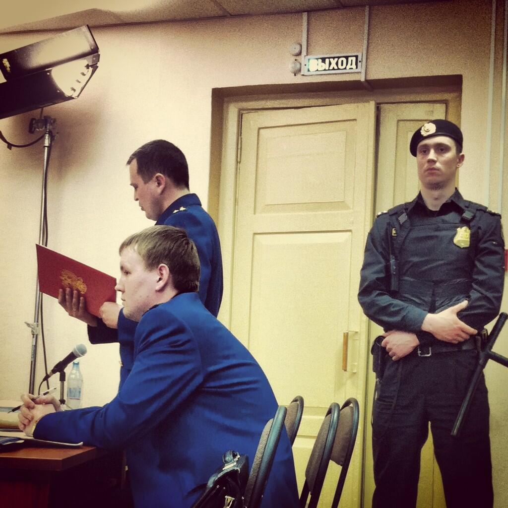 На самом деле, все приставы (и этот тоже) очень любезны и вежливы, много улыбаются и на порядок приветливее и учтивее коллег в московских районных судах. Это отметили, кажется, все столичные журналисты еще неделю назад. Мы сначала думали, что тут всех перед делом Навального проинструктиовали быть предельно внимательными и вежливыми с иногородними гостями и прессой, но вчера я познакомилась с одним из подсудимых, чье дело рассматривается в это же время в Ленинском суде Кирова. Так вот, он утверждает, что приставы и с ним такие же вежливые, и были такими до того как начался процесс Навального.