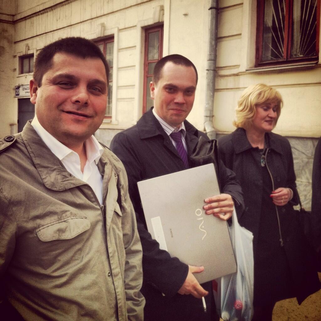Второй фигурант "дела Кировлеса" Петр Офицеров и адвокаты у здания суда.