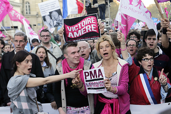 Противники однополых союзов бунтовали по всей стране — в Лионе, Марселе, Тулузе, Нанте и Ренне. Сторонники ЛГБТ митинговали ответно — с плакатами вроде: "Гомофобы, нам не интересно ваше мнение, нам интересны только равные с вами права". Правда, сторонников гей-браков во Франции было в десятки меньше, чем противников.