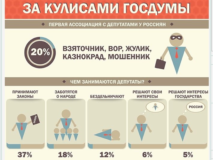 Типичный депутат в представлении россиян скорее заботящийся о собственных интересах взяточник, равнодушный к людям (такие оценки превалируют и существенно), нежели близкий народу, честный человек и блюститель закона, стоящий на страже интересов страны. Парадокс, правда, в том, что конкретная работа этого депутата вызывает куда меньше нареканий: на рабочем месте он занимается принятием законов (37 процентов), заботится о благе народа (18 процентов), занимается государственными делами (5 процентов). Тут негативных оценок поменьше: только 12 процентов посчитали, что на работе депутат бездельничает, 6 — «решает свои личные интересы» (такая формулировка в опросе), 4 — грабит народ.