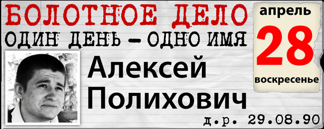 Полихович под арестом с конца июля. Сначала его обвиняли только по 212-й статье (участие в массовых беспорядках). В декабре, после пресс-конференции Владимира Путина, Алексею добавили 318-ю статью (применение насилия в отношении представителя власти). Отвечая на вопрос о мерах пресечения для "болотных узников", Путин говорил о "недопустимости рукоприкладства в отношении представителей правопорядка". По версии следствия, на Болотной Полихович помогал задержанным вырываться из рук омоновцев и при этом "хватался за форменное обмундирование".