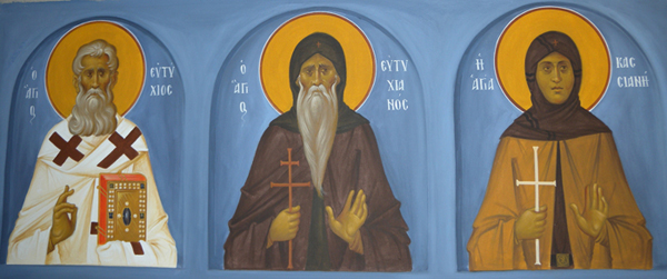 Троица критских святых - Евтихий, Евтихиан и Кассиан Жил епископ Гортины и архиепископ Крита Евтихий во время арабского завоевания Крита (827-961 н.э.). Более ста лет мусульмане владели островом, но ни светская, ни духовная власть Константинополя не могли помочь Криту – в Византии шла борьба между иконоборцами и иконопочитателями. Погребение Евтихия и его брата Евтихиана чудесным образом обнаружил Иоанн Ксен (Чужестранец), родившийся через 10 лет после того как Никифор Фока в 961 году вернул остров под византийскую корону. Вскоре после этой находки Иоанн Ксен построил здесь церковь в честь святых братьев.
