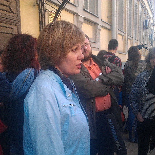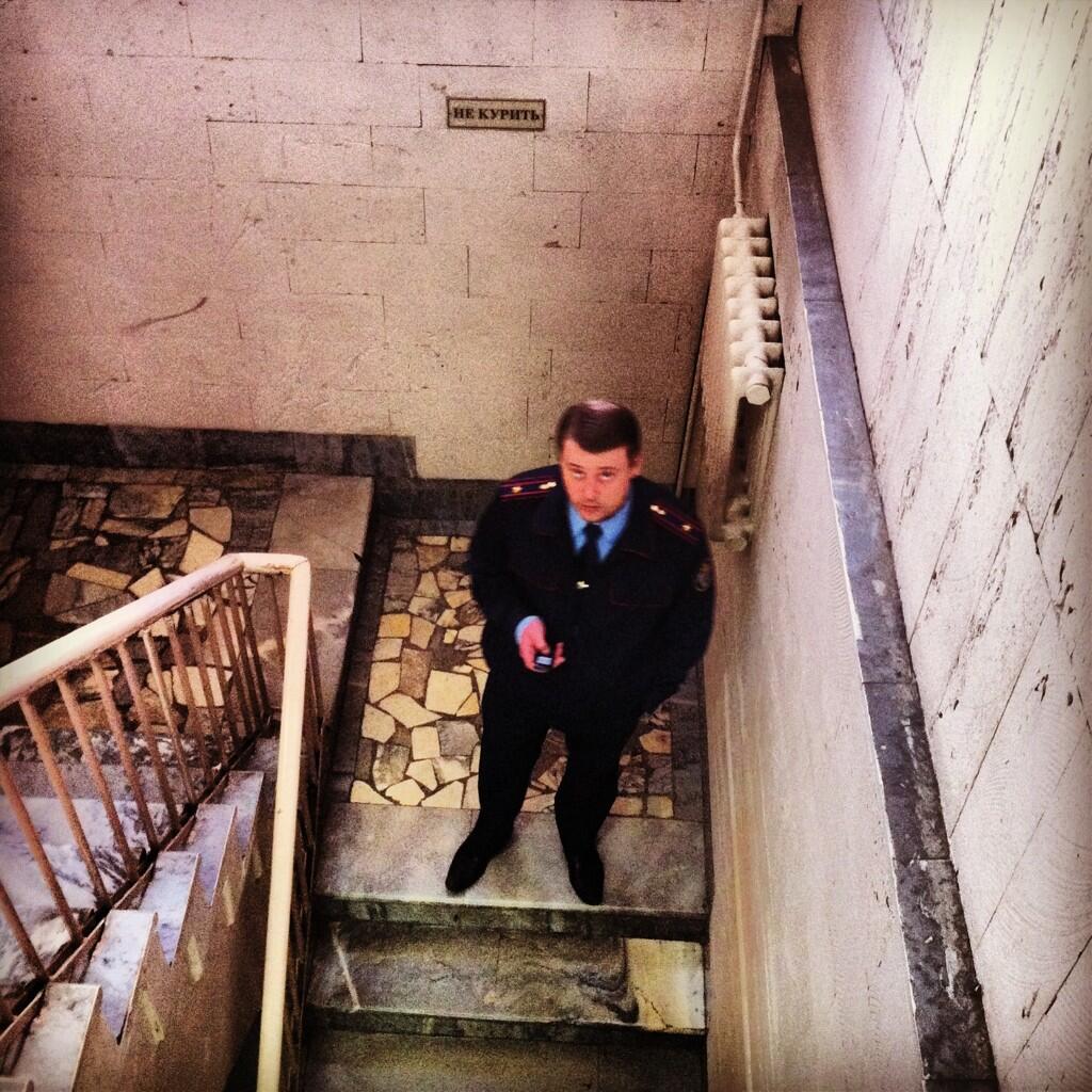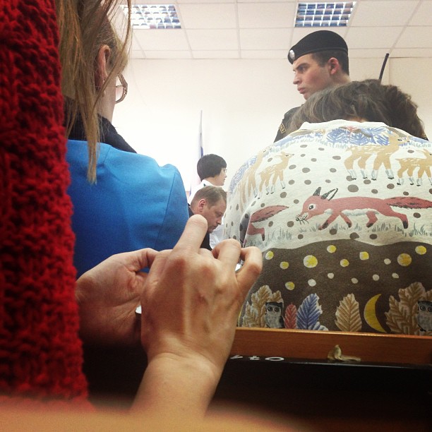 Мария Баронова — обвиняемая по "Болотному делу". Когда она и двое спутников громко посмеялись над фотоколлажем, пристав подошел и неожиданно вежливо для приставов Басманного суда попросил потише, "а то повод не очень веселый". "Это я обвиняемая, а вам-то чего грустить?" — спросила Баронова пристава. " Хороший человек страдает", — ответил тот.