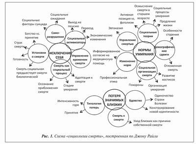Джон Райли выделяет три основные области социологического интереса к смерти: (1) феномен исключения себя из сообществ, (2) потеря значимых близких или серьезность переживаемых утрат, (3) социальные нормы умирания[8]. На основании обзора социальных исследований, написанного Райли, можно построить схематическое представление «социологии смерти» (рис. 1).