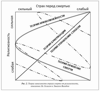 Теория буферизации (buffering theory) рассматривает религиозные представления и верования как своеобразный буфер, блокирующий или задерживающий опасения перед смертью. Основным аргументом здесь выступает отрицание тотального завершения человеческой жизни. Смерть — лишь портал для перехода в жизнь вечную[35] и наиболее значимый рубеж жизни текущей. Соответственно с ростом религиозности и сокращением неопределенности будущего должен снижаться страх перед смертью. Теория управления страхом (terror-management theory) опирается на социальные детерминанты снижения страха[36]. Чем более однородна и многочисленна группа приверженцев некоторой мировоззренческой позиции, тем меньше сомнений в ее правильности, тем больше уверенность в заключениях и выводах, построенных на ее основе. Так, доминирующие религиозные конфессии должны снижать уровень страха в социальной среде, структурируя представления о будущем своих апологетов. Теория управления страхом дает аналогичные теории буферизации предсказания относительно зависимости страха перед смертью от религиозности. Основное отличие, по мнению Эллиса и Ваха-ба, заключается в расширении дополнительных условий и большей объяснительной силе теории управления страхом[37]. В теории криволинейности (curvilinearity theory) отмечается, что вера в Бога не может давать гарантий потусторонней жизни. Верующий, но испытывающий сомнения в вере (что вполне естественно и распространено) человек остается в неведении, что будет происходить с ним после смерти (например, в христианской апологетике — попадет он в рай или ад). Поэтому страх перед смертью будет усиливаться среди людей, находящихся в промежуточной позиции между верой и безверием, не способных полностью принять религиозные догматы[38].