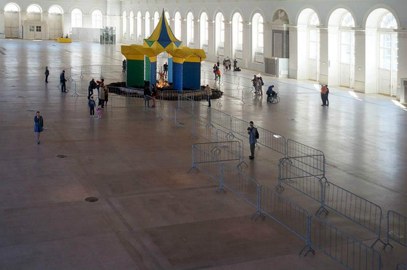 Для создания любой работы на улицах Москвы нужно получить официальное разрешение, пройдя сотню согласований. Или заниматься партизанингом, рискуя быть пойманным полицией. Не все художники готовы тратить время на пробивание проекта, и за неимением ясных возможностей реализовать что-то в масштабах города художники и не думают в таких масштабах. «Уличный» проект удалось реализовать Ирине Кориной на ее выставке «Вооруженные мечтой», открывшейся вчера в Манеже (выставка открыта до 14 мая). В центре главного пространства Манежа размером с площадь – гибрид карусели и торговой палатки, в центре которой горит искусственный костер – пламя из треугольных тряпочек, трепещущих над вентилятором. Конструкция медленно кружится, постукивая, а около ее основания – свежая земля со мхом, веточками и грибами. К этой конструкции ведет коридор, ограниченный металлическими заграждениями, которые используют на митингах и городских праздниках, и приближаясь, понимаешь, что подойти к карусели и войти в нее нельзя – вокруг сплошное беспросветное кольцо таких же ограждений. Праздник, который всегда не с тобой.