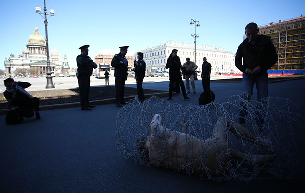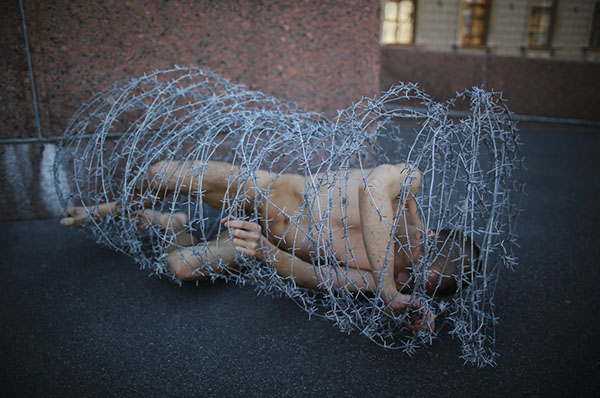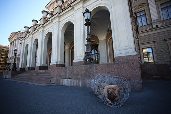 Фото: Reuters Художник Петр Павленский, известный акцией с зашиванием рта в поддержку Pussy Riot, на этот раз решил выразить свой протест против "репрессивной законодательной системы" в России. Павленский разделся догола, завернулся в "кокон" из колючей проволоки и лег перед зданием Законодательного собрания в Петербурге.