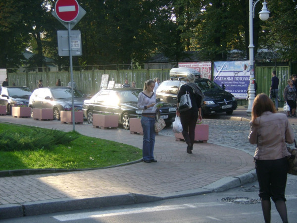 — В дополнение к поднятому тротуару, въезд/выезд в паркинг необходимо обозначить уличными столбиками с шириной между ними чуть больше ширины самого авто (не более 2 метров). Это обязательное условие, потому что как только сделаешь ширину дороги на две машины, тут же с одного края появятся припаркованные на тротуаре машины. А так (с шириной в одну машину) поставить не получиться, потому как автомобилист понимает, что если он на таком проезде поставит машину, то он тем самым заблокируем весь въезд в паркинг.